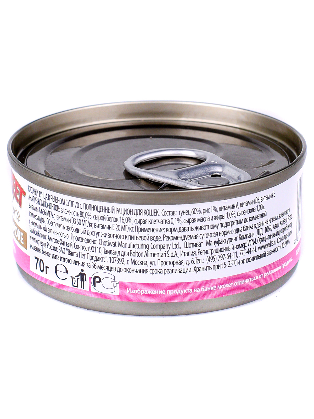 Ингредиенты: тунец 60%, рис 1%, витамин А, витамин D3, витамин Е.