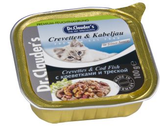 Полнорационное консервированное питание для кошек Dr. Clauder's с креветками и треской в виде мясных кусочках в соусе.