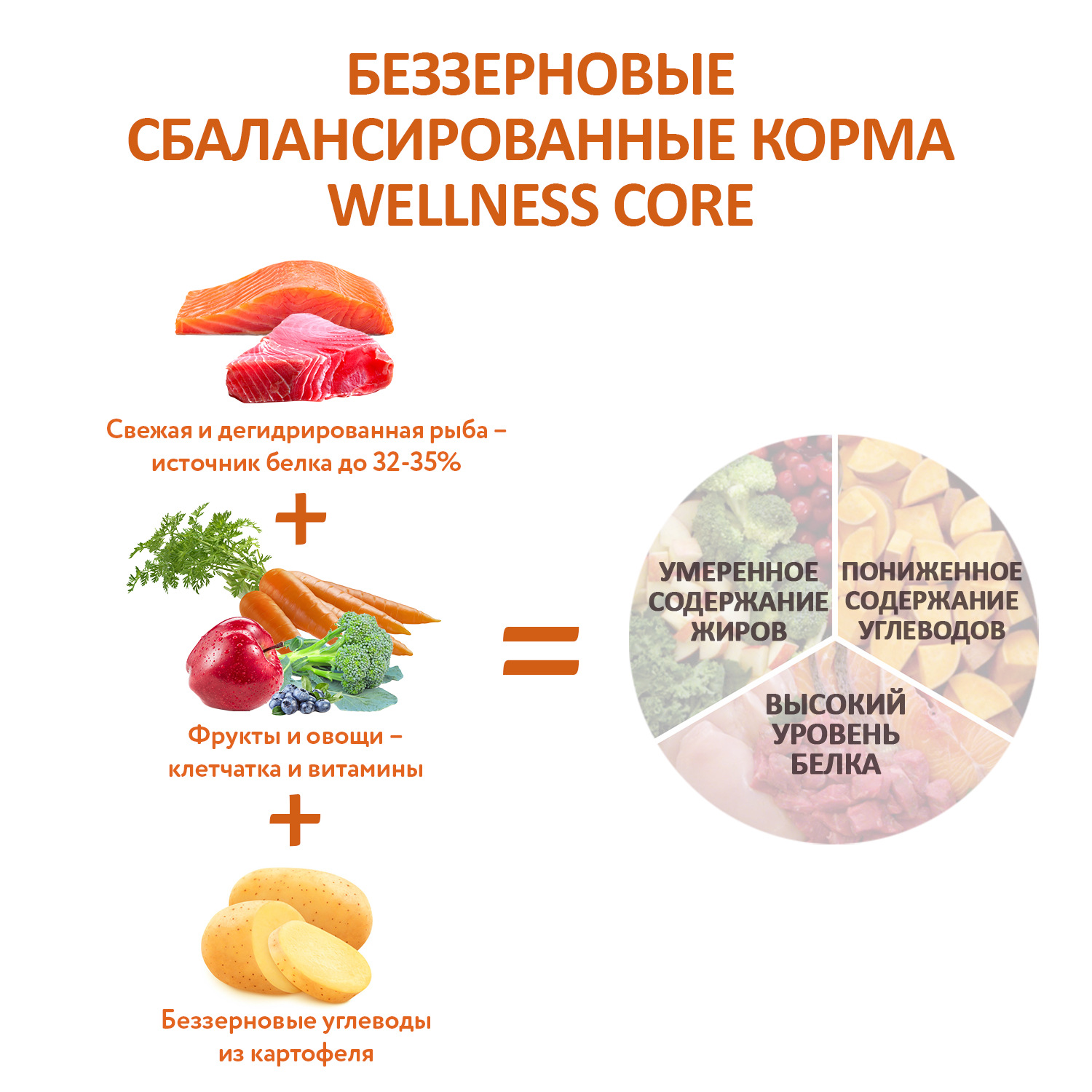 Лосось 32% (свежий лосось 16%, дегидрированный лосось 16%), горох 16%, дегидрированный тунец 13%, сушеный картофель, рапсовое масло, картофельный белок, свекольная пульпа 3%, льняное семя 3%, натуральный ароматизатор, лососевый жир 2%, лигноцеллюлоза, морковь, яблоко, экстракт дрожжей (источник маннанолигосахаридов) 0,5%, сушеный корень цикория (источник фруктоолигосахаридов и инулина) 0,5%, брокколи 0,01%, шпинат 0,01%, томаты, клюква, черника 0,01%, D-глюкозамина гидрохлорид 100 мг/кг, хондроитина сульфат 100 мг/кг, юкка Шидигера.
