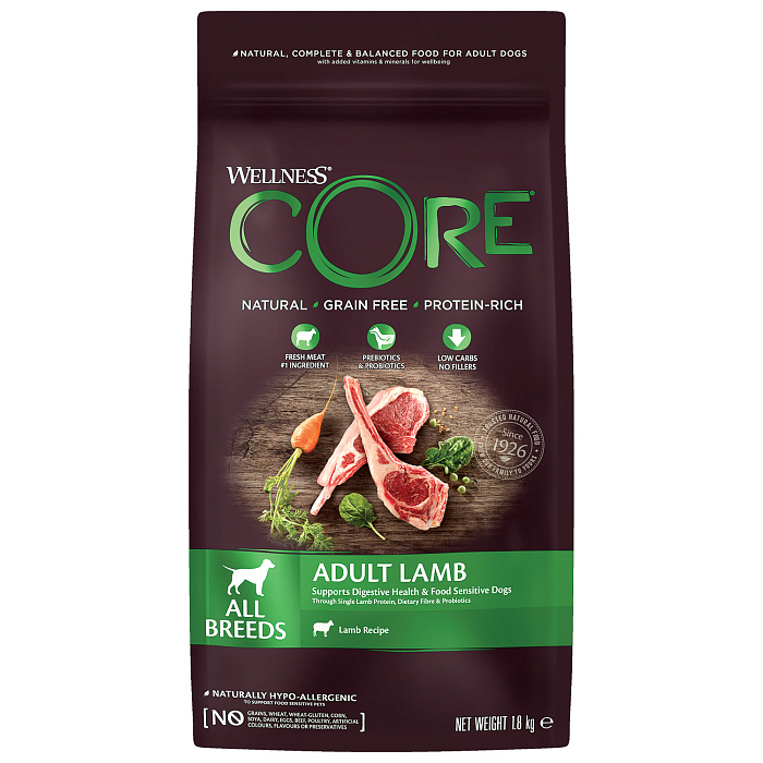 Корм Wellness CORE Lamb создан с учётом естественных потребностей домашних любимцев, которые являются хищниками по своей природе. Именно поэтому все корма Wellness CORE беззерновые и содержат свежее мясо и рыбу на первом месте во всех рационах. Каждый рацион Wellness CORE для собак обладает привлекательным вкусом, хорошо усваивается, не содержит пшеницы, клейковины, кукурузы, сои, молочных продуктов, искусственных красителей, ароматизаторов и консервантов. Хорошее самочувствие зависит от многих факторов, и выбор белка в рационе вашей собаки является ключевым моментом. Белки мяса, такие как свежее мясо ягнёнка, обеспечивают лучшую усвояемость, особенно по сравнению с белками растительного происхождения.