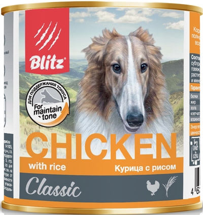 Мясо курицы, говядина и рис составляют основу сбалансированного полнорационного корма для собак Blitz. Благодаря рису, который является источником медленных углеводов и высвобождает энергию плавно, данная формула поддерживает жизненный тонус и повышает выносливость собаки, позволяет питомцу находится в активной жизненной фазе на протяжении всего дня, восстанавливая его силы и активность. Комплекс натуральных витаминов и минералов ежедневно обеспечит вашего питомца всем необходимым для здоровья и полноценной жизни. Корм имеет консистенцию крупнорубленного паштета.