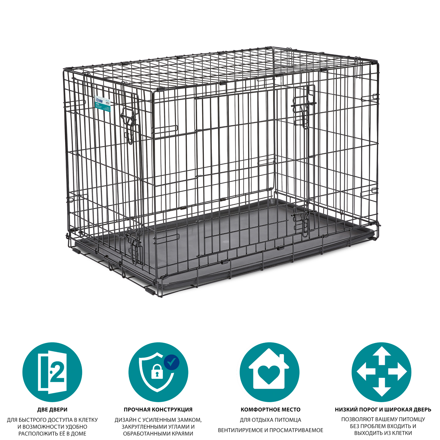 Устойчивая, крепкая клетка выполнена из качественного металла, обработана долговечным черным покрытием Electro-Coat, обеспечивает безопасность животного и хозяина. Двери расположены на смежных боковых сторонах. Удобный, крепкий двойной замок-задвижка позволяет закрыть клетку как снаружи, так и изнутри. В комплект включены: разделяющая панель, пластиковый поддон и специальные пластиковые ручки для удобной транспортировки клетки в сложенном виде. Закругленная угловая защита клетки обеспечивает безопасность питомцам и людям и не повреждает поверхность, на которой размещается. Разделяющая панель позволяет создавать универсальные отсеки. Поддон из композитного пластика легко моется. Клетка легко устанавливается и складывается без использования инструментов. В сложенном виде занимает мало места.